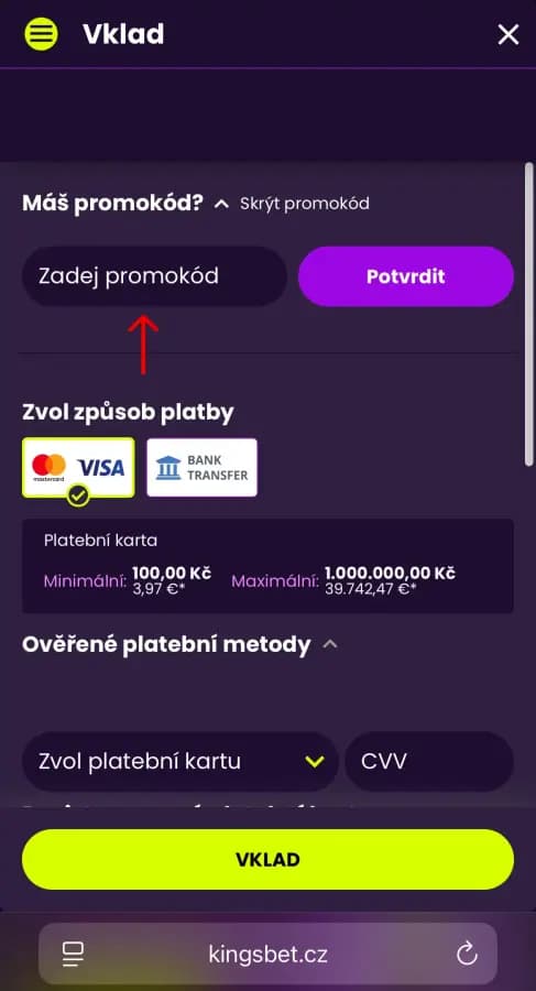 3. Ve Vkladu zadej promokód CASINOHRA