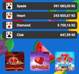 - Diamond (Diamantový) – startuje na 300 000 Kč, jde o hlavní jackpot
