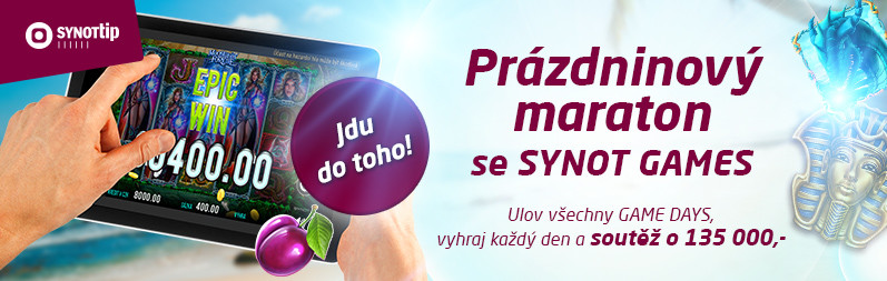 Pokud si je ještě nevyzkoušel, tak teď máš šanci a můžeš si ještě i k tomu přilepšit. SYNOT TIP teď rozjíždí prázdninový maraton a každý den vyhlašuje GAME DAYs s vysokými Bonusy. Nejlepší na tom je, že můžeš získat Bonus každý vybraný den, ale zároveň soutěžíš i o konečný Bonus až 135 000,-. V prázdninovém maratonu si zahraješ jak nové hry, tak i nejvíc oblíbené hry.